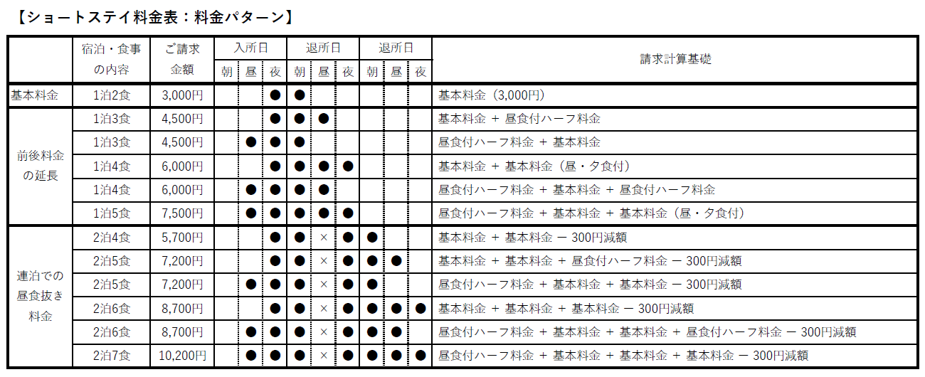 • 連泊期間内においてデイサービス利用等により昼食を取られない場合は、300円/食の減額とします。